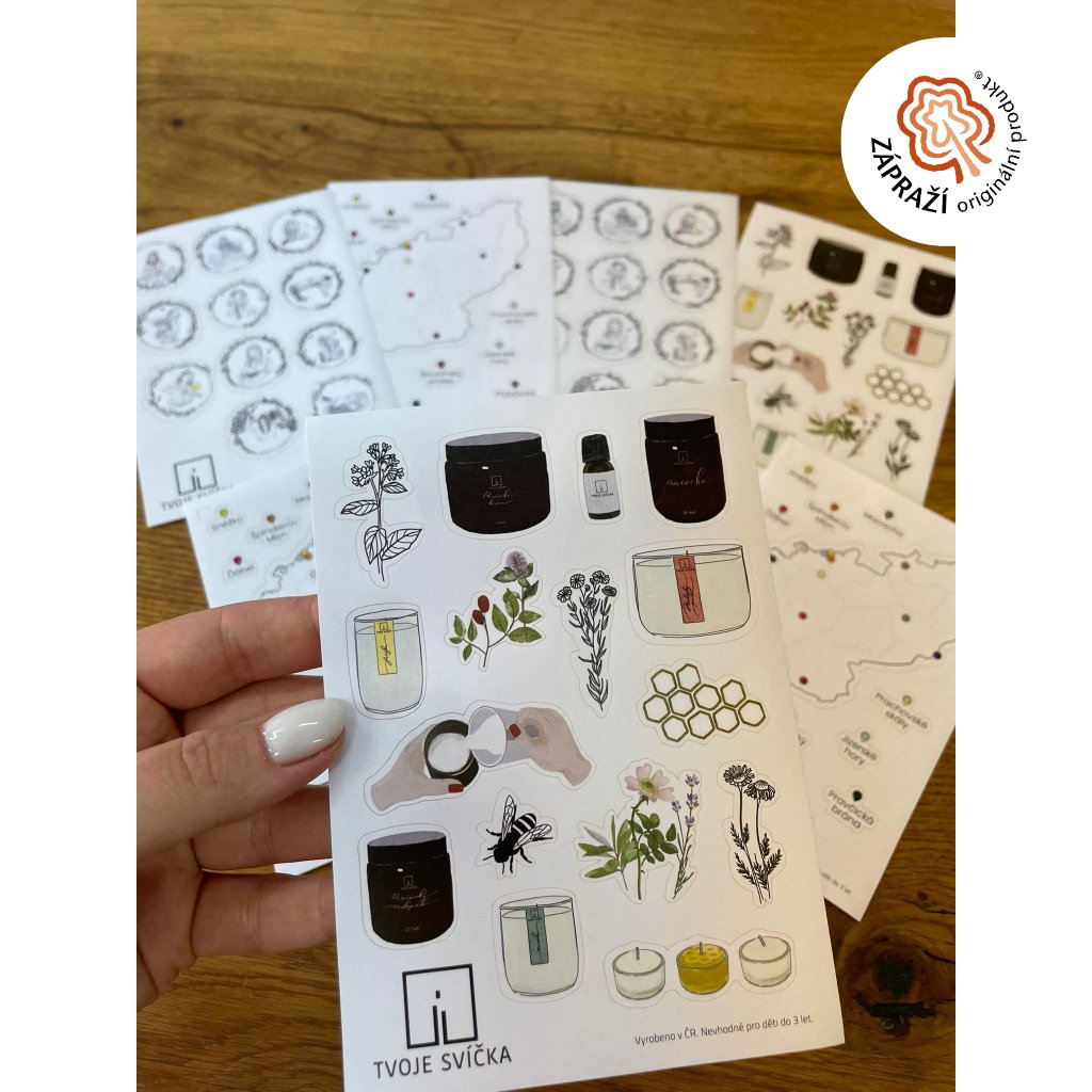 Samolepky jsou vytištěny na kvalitním matném papíře, který působí elegantně a dobře drží na různých površích.